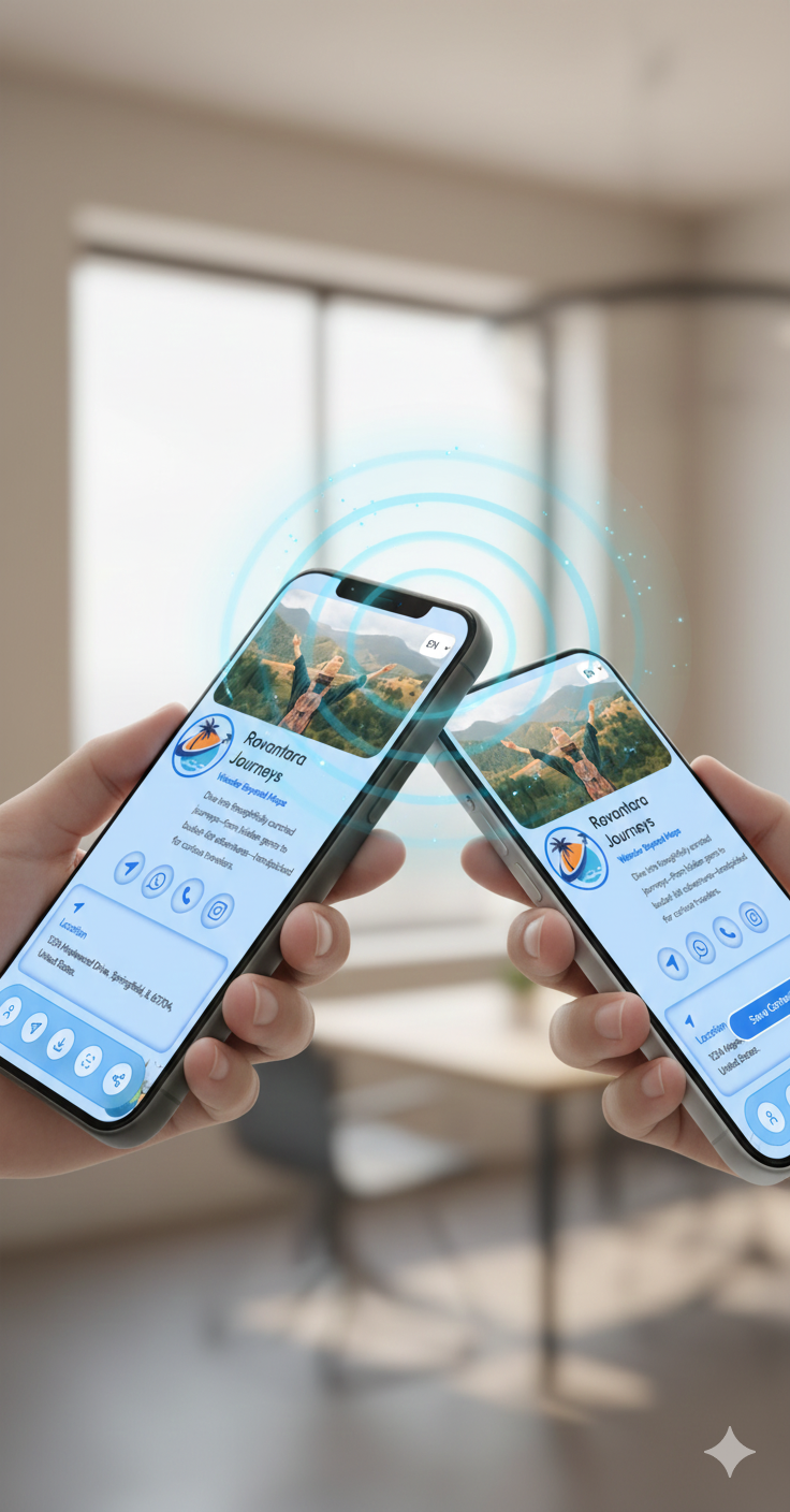 A digital business card (also known as an electronic or virtual business card) is a modern way to share your professional profile instantly without using paper. Unlike a static physical card, it is an interactive digital file or mini-website containing your contact details, social media links, portfolio, and more, which can be shared via QR code, NFC tap, or a simple URL link.
